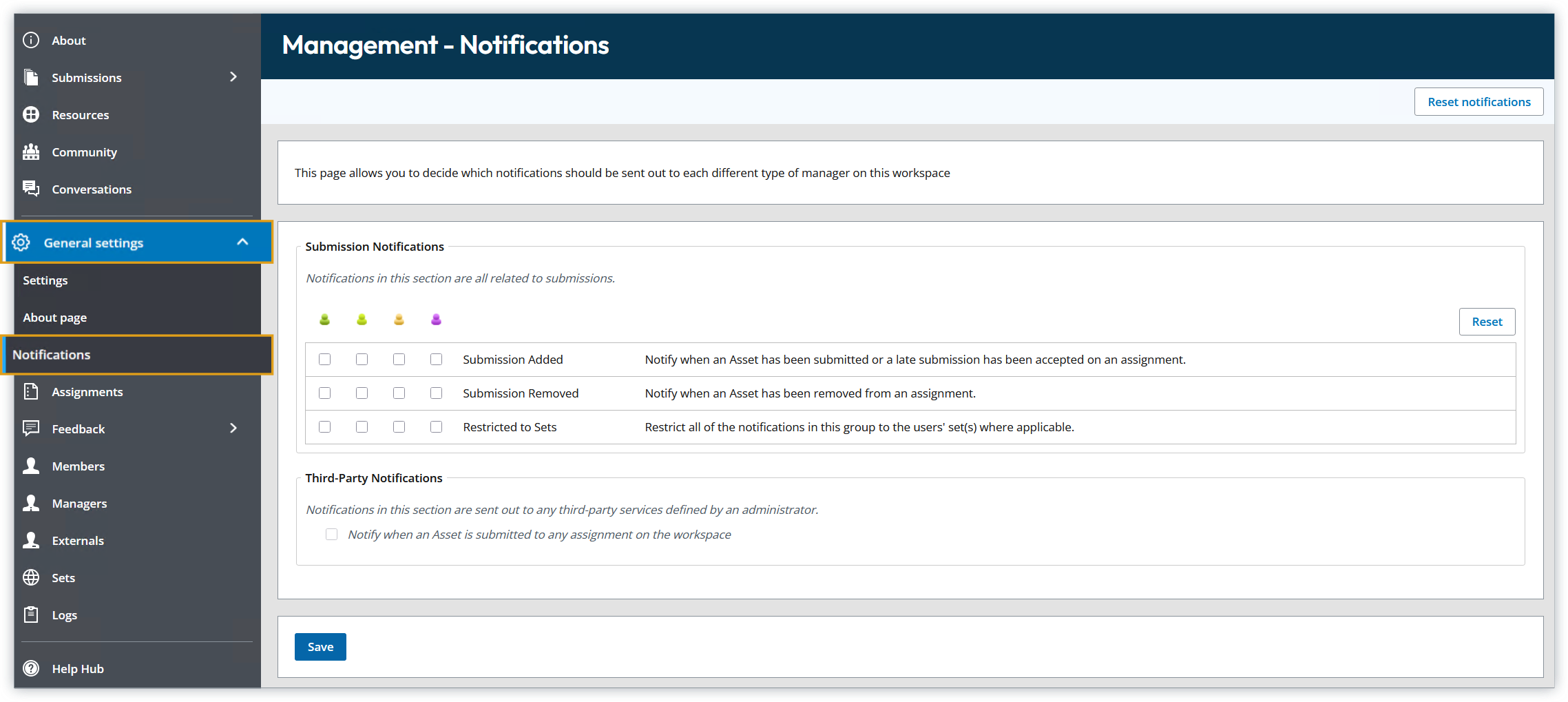 You can set which notifications a manager or external receives when a new submission is: