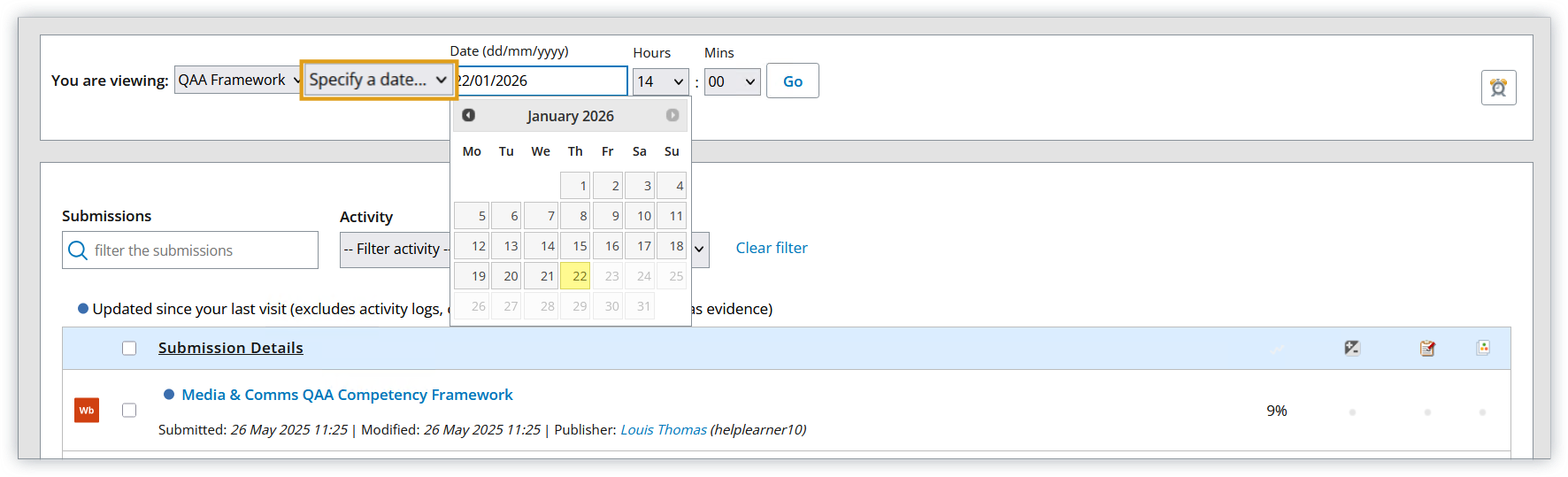 A submission can be seen at a previous point in time, back to the date it was first submitted. Whilst viewing, current changes continue to synchronise, but you will see a fixed version taken from the date selected.