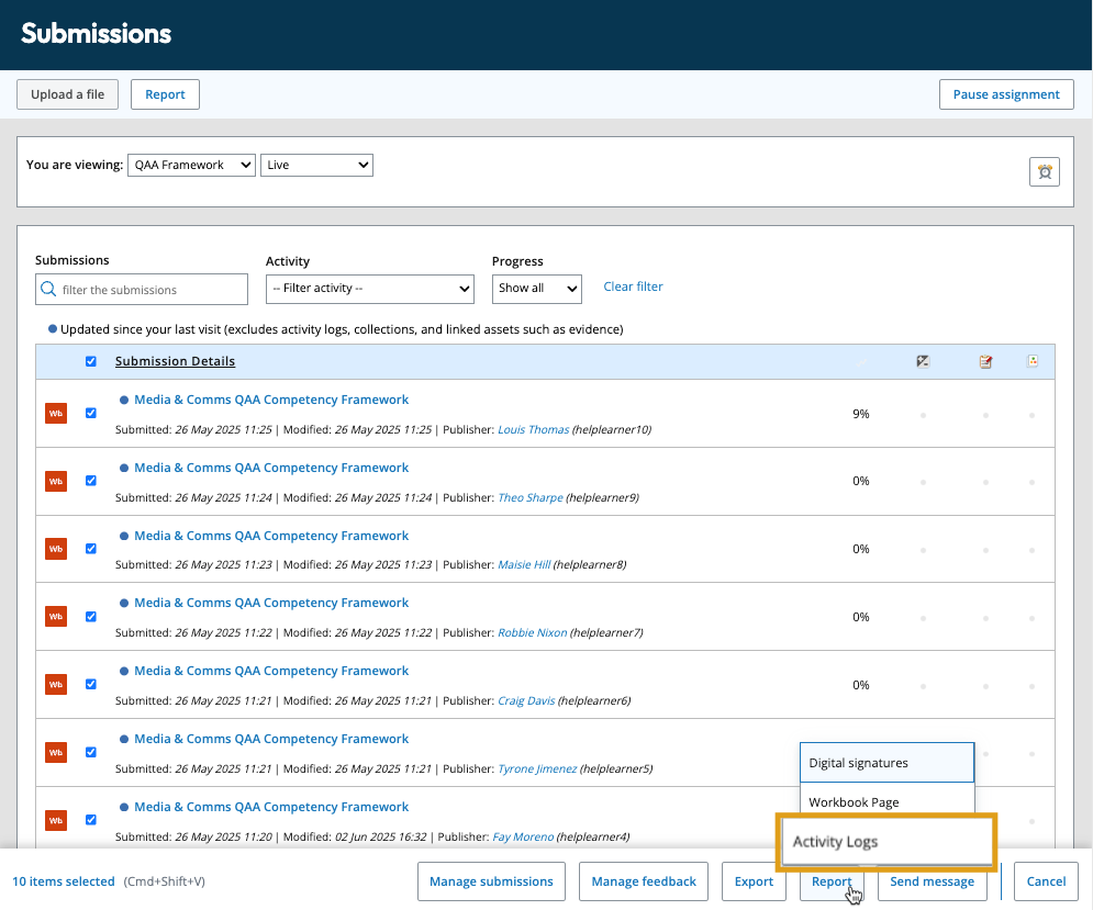 Where a submission contains an activity log, the report provides a summary overview of the target hours or points, and what has been achieved by each learner.