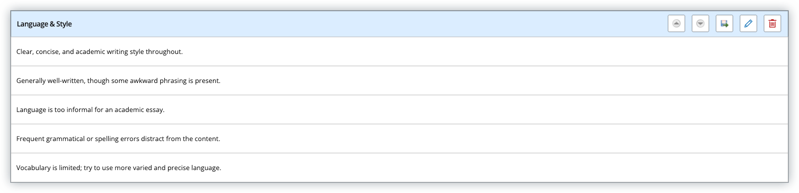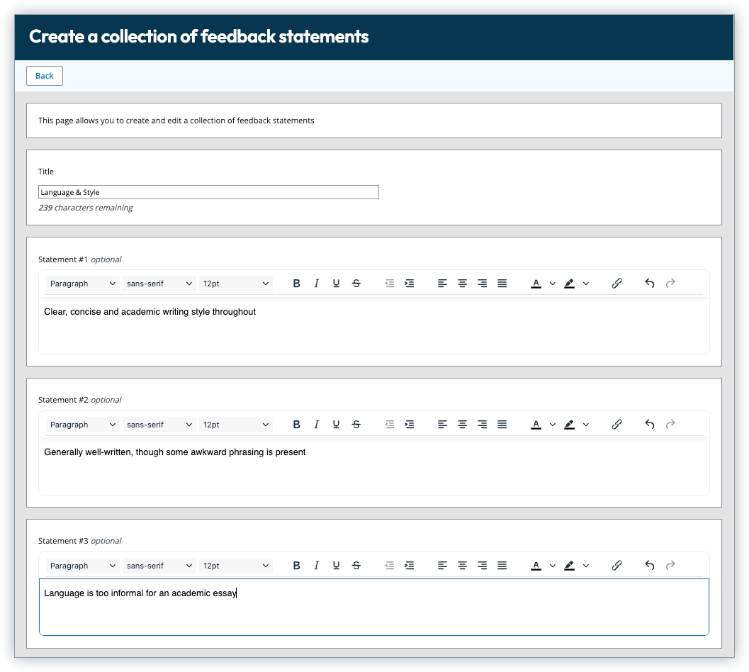 A statement collection typically covers one topic or area, e.g. language and style, with a series of statements to cover the range of possible phrases; e.g. excellent to poor.