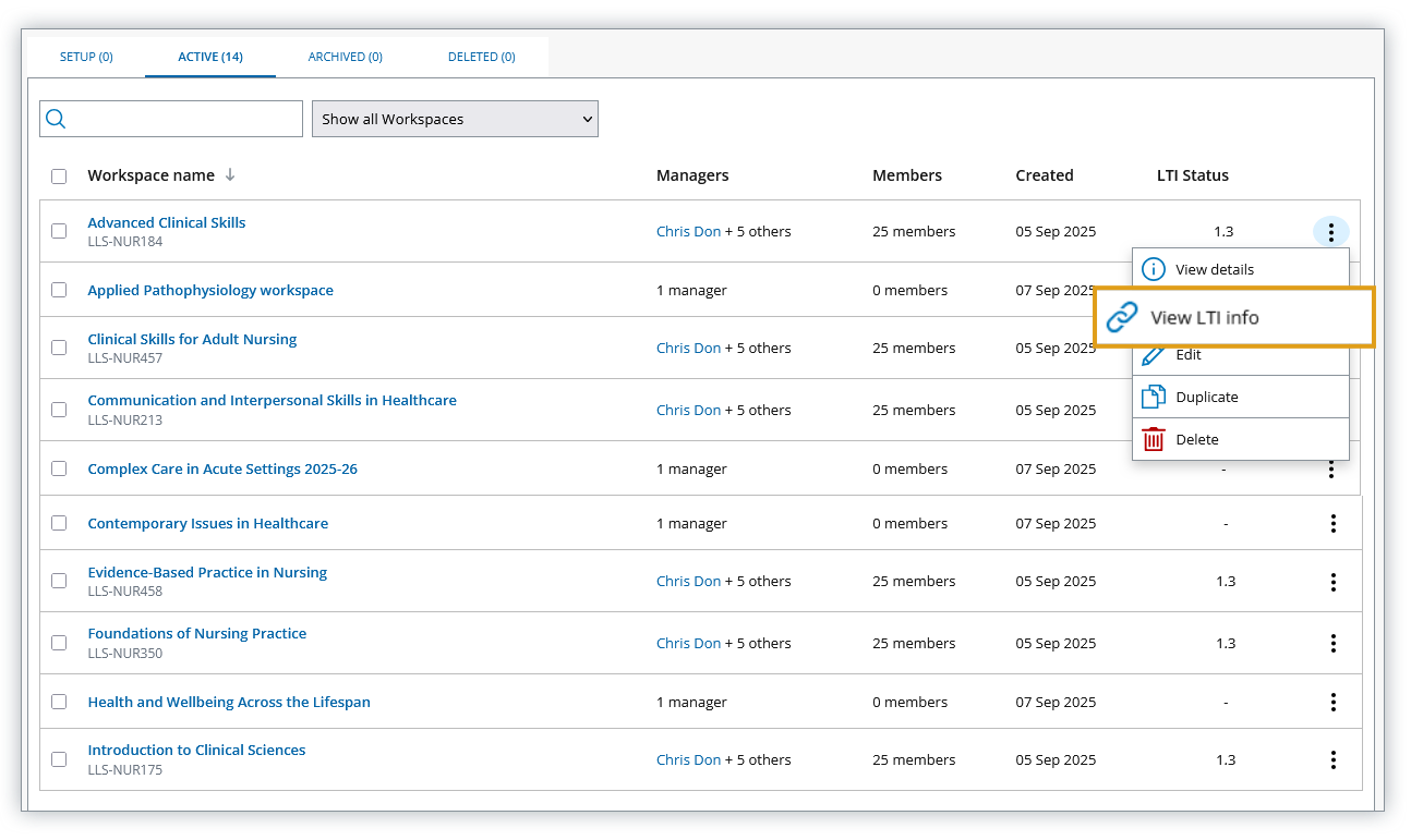 View LTI workspace connections